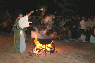 | 湯立て神楽 | 煮えたぎるお湯の中に向かって笹で湯を浴びます | |