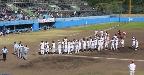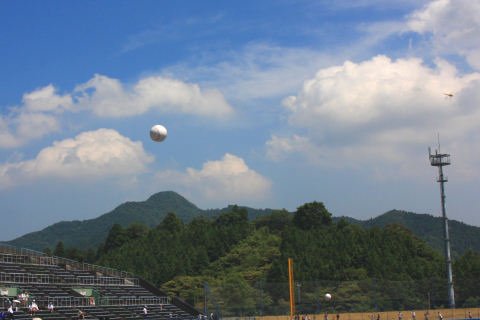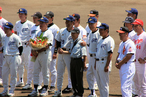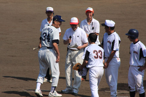 日本プロ野球名球会とOBクラブ会員の元プロ野球選手が野球少年に指導したり 佐伯選抜チームとの親善試合(ドリーム・ベースボール)が佐伯球場で開催されました。 始球式を務めたのはスポーツ少年団の溝口さん 佐伯市出身 名球会野村謙二郎選手 ドリームチームは金田正一監督 90分7回戦の試合、熱戦が続き90分で6回戦まで進み結局9対9の引き分けでした。