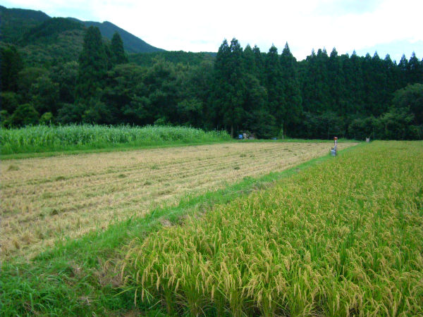 2009年7月10日 最近朝5時になると 「ポカーン」という大きな音で目を覚まします、夕方7時頃まで4〜5分間隔で鳴り響きます。 そうです スズメや猪から大事な米を守る爆音機の季節になったのです。 あと1ヶ月で刈り取りでしょう、今年の作柄はいいようです。
