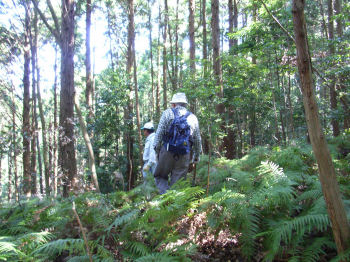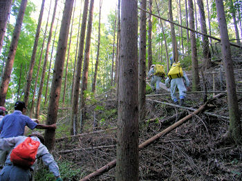 | ここから山に入ります 蜂や蛇に注意です。 | 道無き道を進みます | |