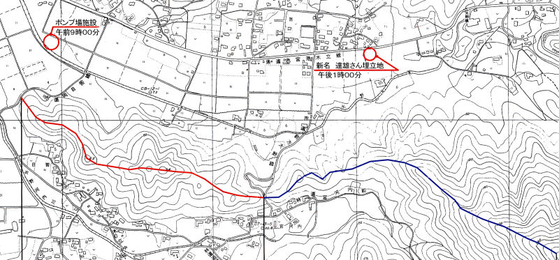 午前9時 ポンプ場施設に集合し赤い線の上(山の尾根)をぐるりと歩き午後から青い線の上を歩きました。