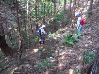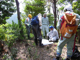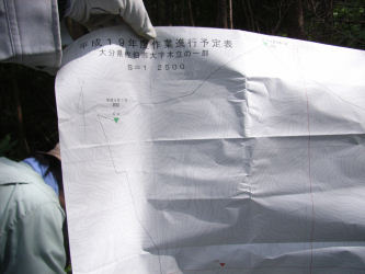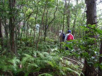 | 3 シダの生茂った中をマムシに注意しながら進みます | 4 ところどころに林業公社の調査ポイントがあります | |