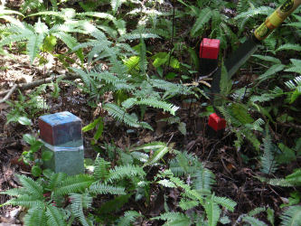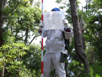 | 三角点にポールを立て写真を撮る | 赤い小さな杭が境界の杭 大きいのはトラバー | |