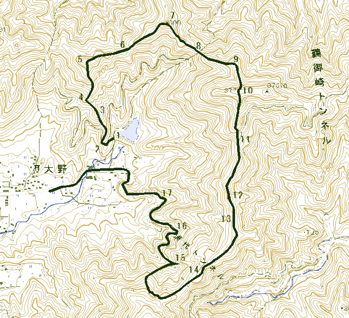 午前8時 1の地点に集合し線の上(山の尾根)をぐるりと歩きました午後5時やっと帰着