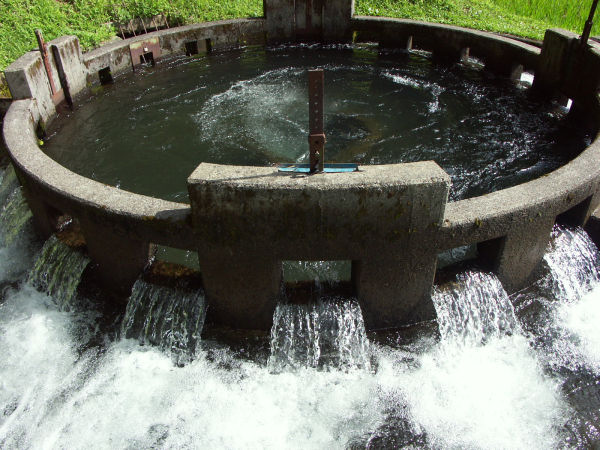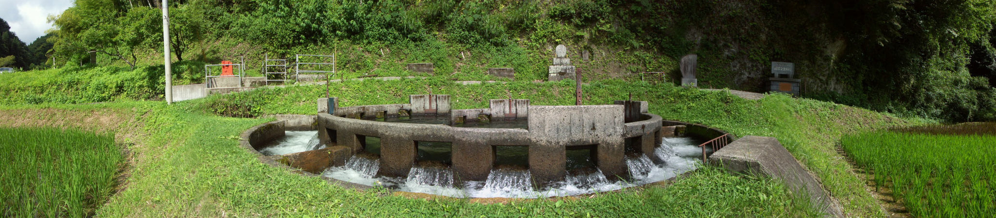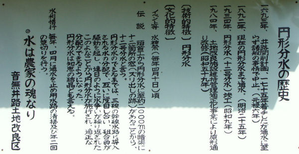 音無井路12号分水です、百木集落に水を引く計画は1693年から考えられており導水路ができたが 水争いが絶えず、知恵を絞った末に円形分水(円筒分水)の採用で円満に解決1934年(昭和9年)に竣工。 今も大切に使われている近代土木遺産です。。