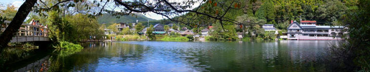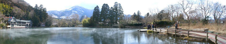 金鱗湖は由布院(湯布院)を代表する観光スポットです。 明治初期の儒学者「毛利空桑」が、湖で泳ぐ鯉の鱗が夕日で金色に輝いて見えたことから 金鱗湖と名づけたそうです。 湖底の一部からは温泉と水が湧き出している周囲約400mの小さな湖です。